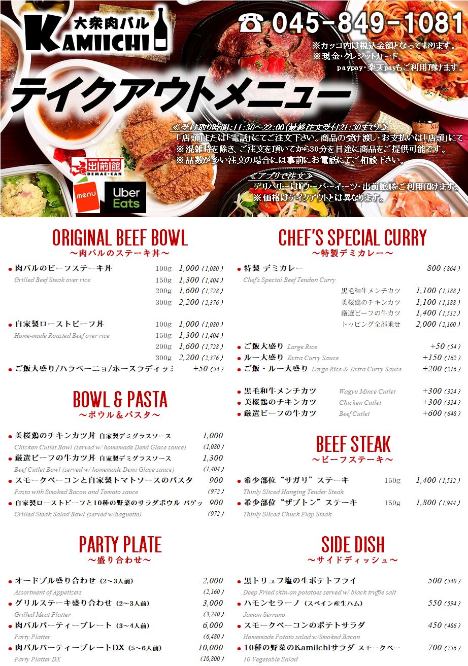 希少部位を使った当店の人気メニュー『ステーキ丼』や、数種類のスパイスと野菜でじっくりと煮込んだ『特製デミカレー』、おつまみにも最適な生ハム・ポテトフライ・サラダなど、是非この機会にご家庭で肉バルKamiichiの味をお楽しみ下さい。