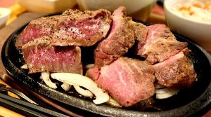 こちらの牛ハラミを自家製のハーブ塩でしっかり味付けをし、表面をしっかり焼き上げ、熱々の鉄板に玉ねぎたっぷり、肉たっぷりで提供します。