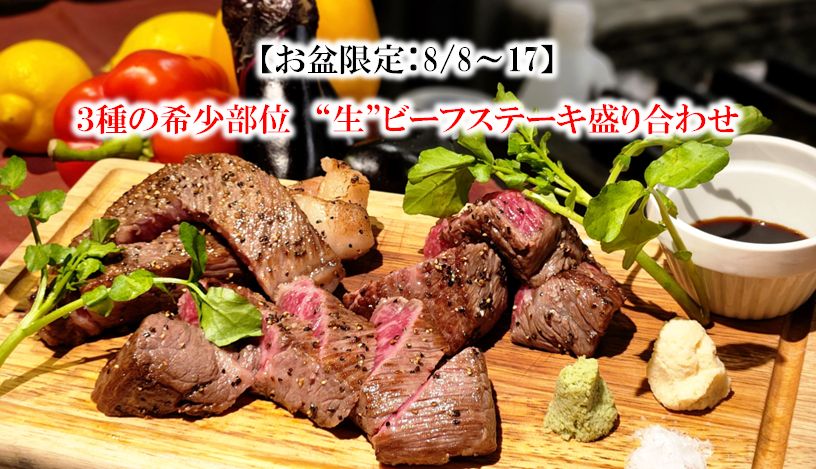 【お盆限定:8/8~17】3種の希少部位 “生”ビーフステーキ盛り合わせ(特別価格:3,800円)