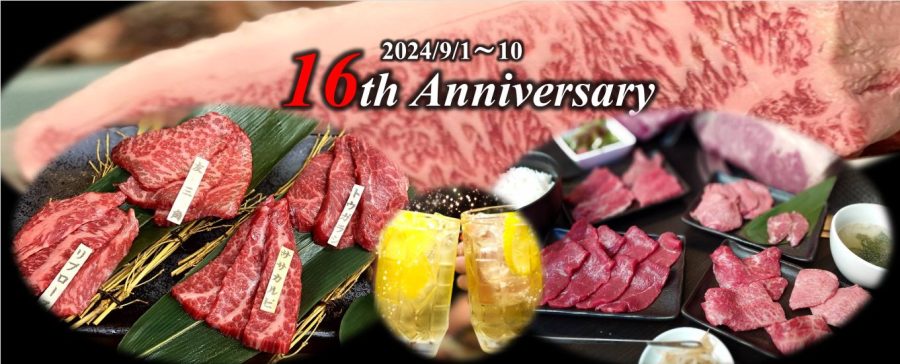 16周年の今回は、当店自慢の「生」で仕入れる希少なタンとハラミ、一頭買い黒毛和牛の希少部位カルビとロース。