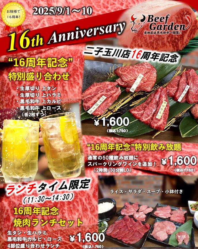 【16周年記念】上タン・上ハラミ・上カルビ・上ロースの特別盛り合わせ&焼肉ランチ&飲み放題(9/1~10)