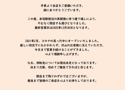平素より当店をご愛顧いただき、誠にありがとうございます。 この度、赤羽駅前周辺の再開発に伴う建て壊しにより、やむなく閉店する運びとなりました。 最終営業日は2025年12月30日となります。 ...