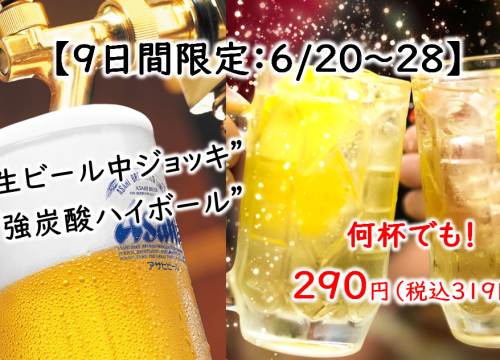 大衆肉酒場 赤羽ふじ屋、店長の吉田です。 毎月恒例の『特別フェア』、6月の今回は『生ビール&ハイボールを290円』でご用意しました。 大変お得な9日間となっておりますので、この機会...
