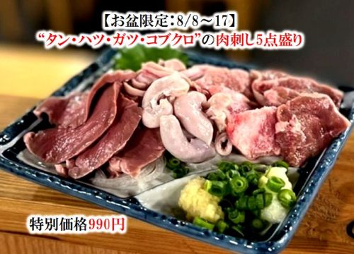 おはようございます。 赤羽ふじ屋、店長の吉田です。 毎年恒例のお盆限定メニュー、今年は『肉刺し5点盛り』をご用意しました。 お盆期間中も通常通りの営業で、土祝日は12:00オープンです。...
