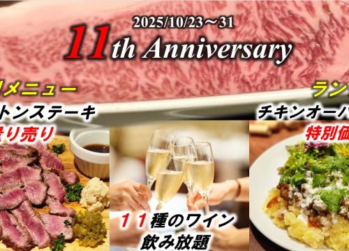 【Salt中目黒:11周年記念】“生”ザブトンステーキ&11種のワイン飲み放題(10/23~31)