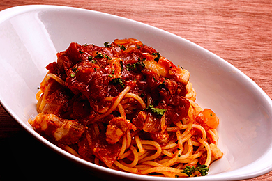 イタリアでは「カチャトーラ」とも呼ばれ、鶏もも肉を玉葱・パプリカ・オリーブ・香草などと一緒に、トマトで煮込んだ一皿です。